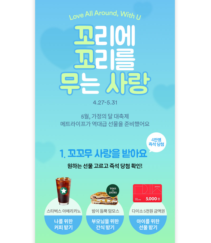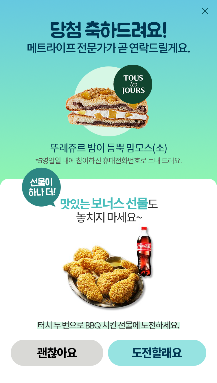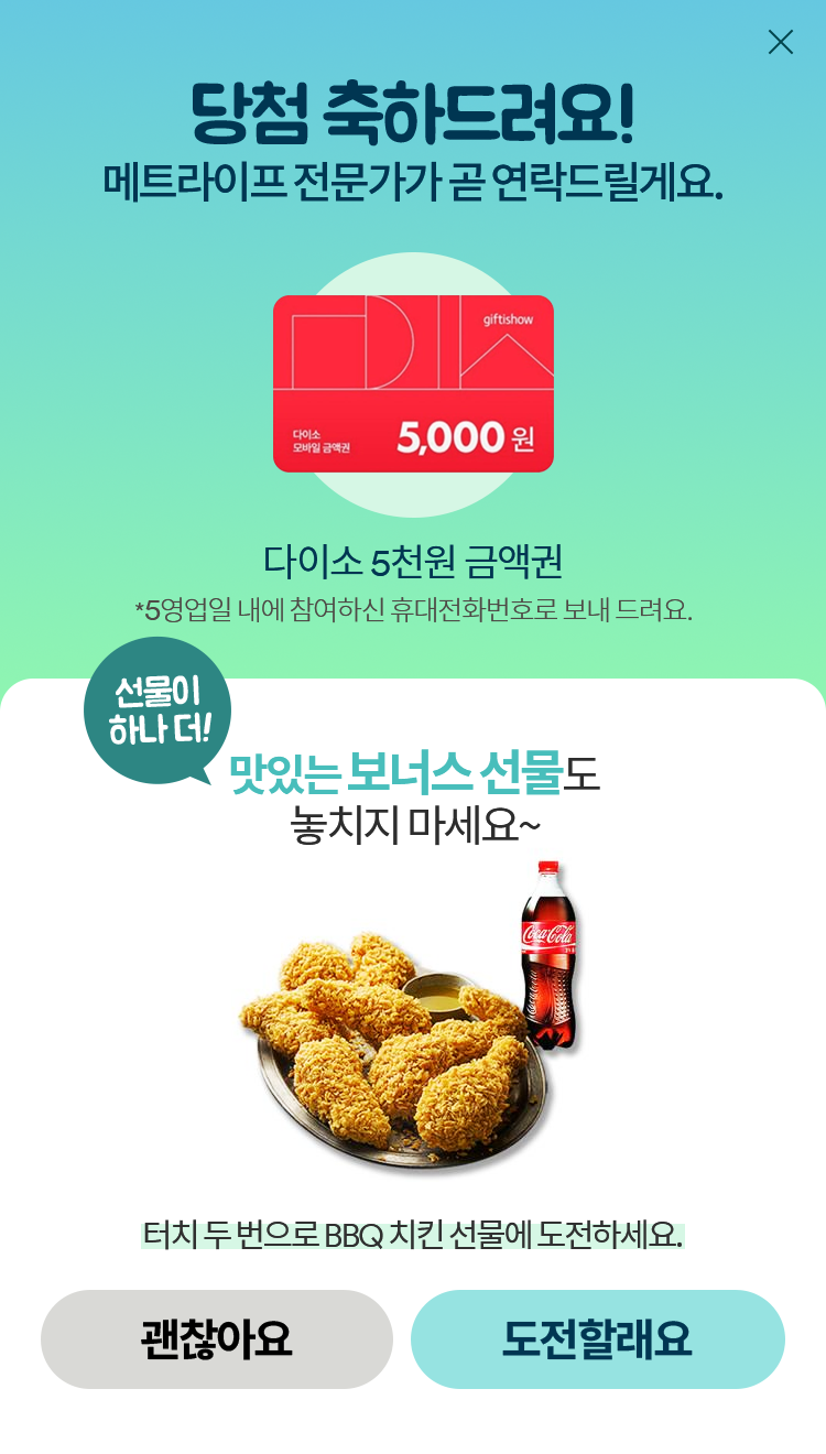 위의 개인정보 제공에 대해 거부하실 수 있지만, 동의하지 않으시면 이벤트 참여가 불가합니다. 동의한 후에도 홈페이지나 고객센터를 통해 언제든 철회할 수 있어요.(1588-9600, www.donotcall.go.kr)