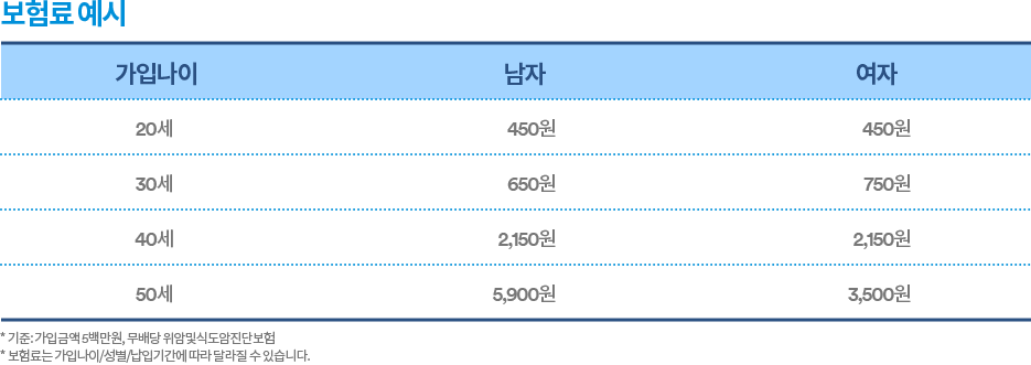 보험료는 계약자의 가입나이, 성별 등에 따라 달라질 수 있습니다.