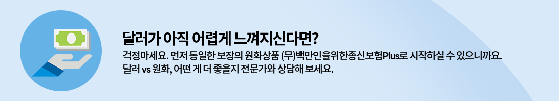 - 외화보험은 보험료 납입, 보험금 수령 과정에서 환전수수료 등 거래비용이 발생할 수 있습니다.